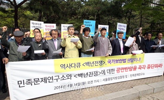 검찰 조사에 대응하느라 후속 다큐 제작에 집중하지 못하고 있다는 김 감독은 “시간이 걸리더라도 꼭 끝까지 만들 것”이라며 두 주먹을 불끈 쥐었다. 현재 검찰은 <백년전쟁> 명예훼손 사건을 당초의 형사부 담당에서 공안부로 재배정해 수사하고 있다. 대한민국 역사의 정통성을 부인하는 내용을 담고 있고 정치적 색깔을 보이는 내용이라는 점 등을 감안했다는 설명이다. 이에 대해 민족문제연구소측은 지난 4월 14일 기자회견을 열고 “<백년전쟁>은 철저히 사료에 입각해 만든 역사 다큐멘터리”라며 “무리한 공안몰이 수사를 즉각 중지하라”고 촉구했다. 김 감독은 다큐 제작을 미룬 채 지루한 법정 공방을 벌여야 하는 상황에서도 낙관적인 태도를 잃지 않았다.
