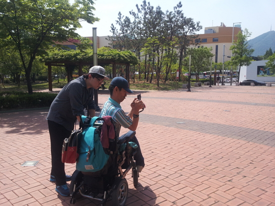 불편한 두 손을 모아 일그러진 얼굴로 휴대전화 화면을 응시하고 있는 오명진(40)씨에게 이름을 물었더니, 그는 마음대로 움직여지지 않는 손으로 이름 석 자를, 자음 하나, 모음 하나씩을 천천히 수화로 그려냈다. 그는 “강아지 사진, 아기들 사진을 많이 찍어서 기분이 좋다”고 말했다. 활동보조인 김상욱(24)씨는 “평소에도 강아지와 아이들을 좋아해 길을 가다가도 멈춰서 한참 보곤 한다”고 말했다.
