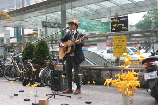 홍대입구역 2번 출구 앞에서 그의 노래 ‘사월목련’이 잔잔히 흘렀다. “남들도 나처럼 외로웁지요, 남들도 나처럼 흔들리고 있지요...." 지난 해 나왔던 곡이지만 4월 16일의 세월호 희생자들을 추모하며 부르는 것이어서 더욱 구슬펐다. ‘현장에서 사람들과 어울려 노래할 때 가장 행복하다’는 그는 경제적으로 힘들어도 죽을 때까지 노래할 수 있으면 좋겠다고 말했다. 사람들의 고통과 상처를 노래로 달래는 것이 그의 일이지만, 자신도 그 노래를 통해 크나큰 위로를 받는 모습이었다.