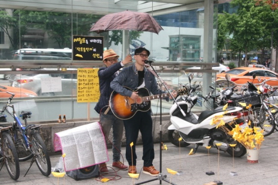 지난 5월 11일 오후 2시 무렵, 서울 홍대입구역 2번 출구 앞에서 ‘세월호를 지켜보는 작은 음악가들의 선언’ 공연이 조용히 시작됐다. 행인들은 무심히 지나치고, 시끄러운 차량 소리에 노래가 묻혔다. 음악가들이 노란 종이로 만든 바람개비를 건네자 지나가던 몇 사람이 발길을 멈췄고, 곧 20여명으로 불어난 청중이 보도에 둘러서서 귀를 기울였다. 기타 하나, 스피커 하나가 공연 장비의 전부인 음악가들은 세월호 참사 희생자들을 위한 추모곡 ‘미안해, 정말 미안해’ 등을 혼신을 다해 불렀다. 흐린 하늘에서 빗방울이 떨어지기 시작하자 이광석(43)씨가 우산을 꺼내 손병휘, 백자, 조동희 등 동료가수들을 씌워주었다.