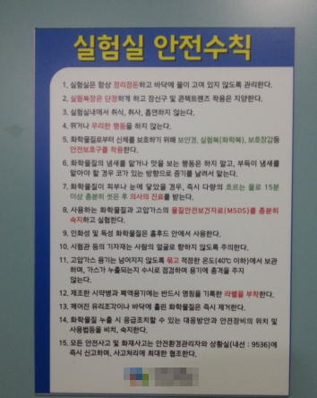 이씨는 이처럼 실험실에서 필수적인 보호안경 등을 쓰지 않는 것을 대수롭지 않게 생각하는 연구자가 적지 않다고 말했다. 보호장구의 중요성에 대해 교육이 철저하게 이뤄지지 않고 있기 때문이다. 이씨가 석사과정을 시작한 지 6개월이 넘었지만 안전교육이라곤 실험실 벽에 붙은 안전수칙을 한 번 읽은 게 전부였다고 한다.