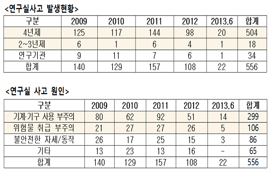 이런 안이한 태도는 곧잘 사고로 이어진다. 새정치민주연합 최민희 의원이 지난해 10월 미래창조과학부 국정감사에서 낸 보도자료에 따르면 2009년부터 2013년 6월까지 발생한 연구실 사고 556건 중 94%인 522건이 대학에서 일어났다. 또 사고 원인 중 88%인 491건이 기계·기구 사용부주의, 위험물 취급 부주의, 불안전한 자세 등 연구자의 부주의로 분류됐다.