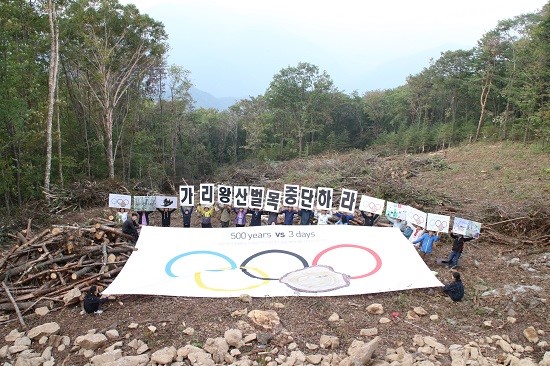 문제는 지난 2012년 정부가 가리왕산 일대를 평창올림픽 알파인활강경기 부지로 선정하면서 발생했다. 산림청은 2013년 가리왕산의 보호구역 일부를 해제했고, 지난달 17일에는 시공사가 본격적인 벌목작업을 시작했다. 녹색연합, 우이령사람들, 환경운동연합 등 환경시민단체들이 반발하며 공사 중단을 요구했지만, 강원도와 평창동계올림픽 조직위원회는 ‘이미 (당국간) 협의가 끝난 사안’이라고 일축했다.
