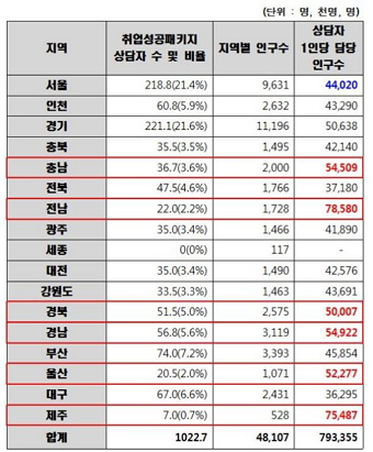 이렇게 혜택이 적지 않은 프로그램이지만 비수도권 거주자가 이용하긴 쉽지 않다. <단비뉴스>가 정보공개청구를 통해 입수한 2014년 전국 취업성공패키지 자료에 따르면 우선 담당인력이 서울과 경기도에 몰려있다. 취업성공패키지 상담자 수는 경기지역이 221명으로 가장 많았고 서울이 218명, 나머지 시도는 각각 30~70 여명 선에 머물렀다. 이를 지역별 인구수로 나눠보니 상담자 1인당 인구수가 전라남도, 제주 등 일부 지역은 최대 7만 8천여 명으로 서울(4만 4천여 명)의 2배 가까이 됐다.