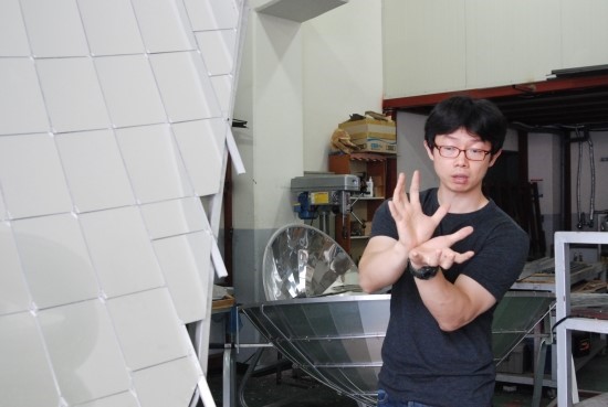 대형 차고문과 같은 셔터를 열고 들어서자 왼편으로 접시안테나처럼 생긴 커다란 햇빛반사판이 창고 천장에 닿을 듯 서 있었다. ‘쉐플러 리플렉터(Scheffler Reflector)’라 불리는 설비로, 태양의 이동경로를 추적해 열을 한곳으로 집중시켜 음식을 조리하는 기구다. 약 250장의 오목거울을 철사로 일일이 이어 붙여 만든 이 설비의 크기는 약 10제곱미터(㎡)다.