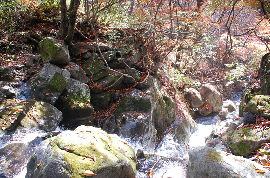 옛길과 물길이 시멘트길과 만나는 지점 근처에 옛 다리 흔적이 있었다. 다리 상판은 없어지고 개울 양쪽에 넓적한 바위가 켜켜이 놓여 있었다. 해설사는 “저건 예전에 다리를 놓았던 자리"라고 일러주었다. 설명을 듣고 맞은편을 보니 마찬가지로 바위가 쌓여 있는 것을 볼 수 있었다.