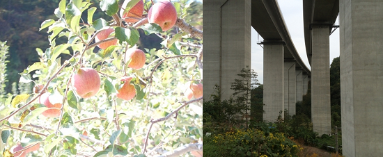 그러나 고가도로 밑을 지나 조금 걸으면 고속도로의 소음마저 터널 속으로 빨려들고 아기자기한 전원 풍경이 펼쳐진다. 야트막한 언덕은 온통 사과밭이다. 수확을 앞둔 사과가 가느다란 가지가 안쓰러울 정도로 다닥다닥 매달렸다.