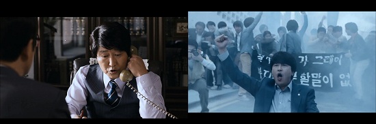 그러나 휴가 중인 군의관의 상태가 당국에 의해 탈영으로 바뀌어 버리면서 결국 국보법 사건은 유죄판결로 끝이 난다. 최선을 다해 변호한 우석에게 아주머니는 국밥을 말아주며 위로한다. 영화의 화면은 어두워진다. 다시 밝아지면서 도로 위에서 확성기를 든 우석이 보인다. 우석의 뒤로는 시위대가 있고, 앞에는 무장경찰이 달려오고 있다. 이 장면이 영웅서사구조 단계 중 죽음(평소의 주인공)/부활(새로운 가치를 받아들인 주인공)에 해당한다. 세무변호사 우석의 죽음과 민권변호사 우석의 탄생이다.