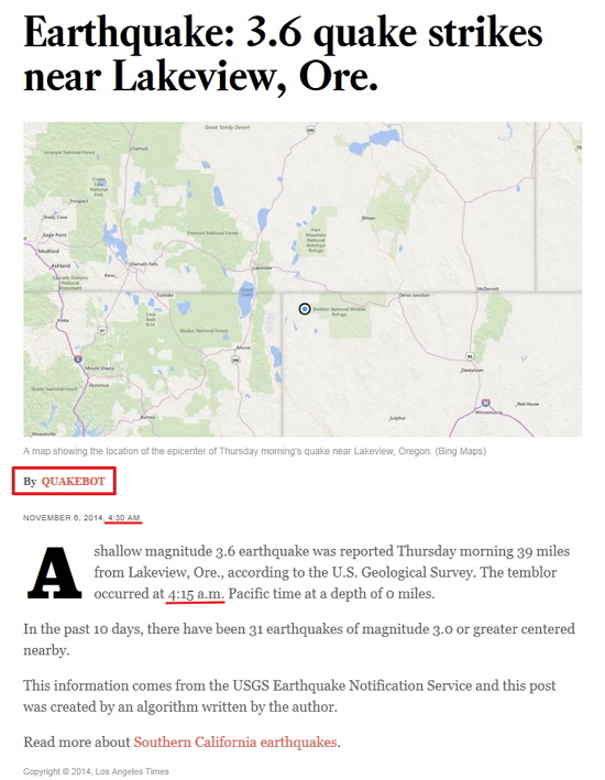 미국 시간으로 지난해 11월6일 오전 1시31분, <LA타임스> 홈페이지에는 지도 이미지 한 컷과 함께 ‘지진: 레이크뷰(미국 오리건주 레이크카운티에 있는 도시)에 규모 3.8 지진 발생’이라는 제목의 기사가 올라왔다. 첫 번째 기사가 실린 지 3시간만인 오전 4시 30분에는 또 다시 ‘지진: 레이크뷰에 규모 3.6 지진 발생’이라는 제목을 단 동일한 형식의 기사가 올라왔다. 두 번째 기사는 지진이 일어난 지 단 15분 만에 작성된 기사였다. 이 두 기사를 쓴 기자는 ‘퀘이크봇(Quakebot)’이다.