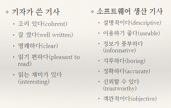하나는 2014년 3월 스웨덴 클러월 교수가 대학생 46명을 대상으로 한 실험 논문으로, 기사작성자를 밝히지 않는 블라인드 테스트 방식을 이용해 사람과 로봇이 작성한 기사를 객관적으로 평가하게 했다. 그 결과 로봇이 알고리즘을 이용해 작성한 기사에 대해 ‘지루하다’고 평가한 반면 사람이 작성한 기사에 대해서는 ‘읽는 재미가 있다’고 평가한 부분이 가장 뚜렷하게 구별되는 특징으로 나타났다. 아직은 로봇이 인간의 재미를 충족시키지는 못한 것이다. 하지만 그 밖의 평가에서는 두 기사를 구분 짓는 명확한 기준이 나타나지 않았다. 오히려 ‘정보가 풍부하다’, ‘신뢰할 수 있다’, ‘객관적이다’ 같이 기사가 갖춰야 할 기본항목에서 로봇이 작성한 기사가 더 좋은 평가를 받았다.