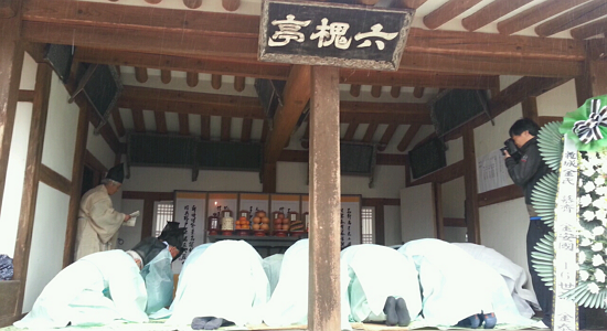 제례가 시작되자 각 문중 대표가 한 명 씩 앞으로 나와 술잔을 올리고 절을 했다. 한 사람 한 사람 엄숙하게 술잔과 명태포를 올리는 동안 20여명의 후손들은 진지하게 주시했다. 40여분에 걸친 추모제는 참석자들이 모두 큰 절을 올리는 것으로 마무리됐다. 행사가 끝나자 참석자들은 각자 조상에게 올린 술을 나눠 음복하며 서로의 수고를 치하했다. 육성회 총무를 맡고 있는 오정재(58‧이천시 증포동)씨의 아내 박상수(57))씨는 “사는 곳이 다르고 본가도 다르지만 1년에 한 번 큰 행사를 하면서 형제처럼 만난다”고 의미를 부여했다. 참석자의 4분의 1 정도는 서울 등 외지에서 일부러 내려왔다고 한다. 비가 내리는 와중에도 관광객 10여명이 호기심 어린 눈으로 추모제를 지켜봤다.