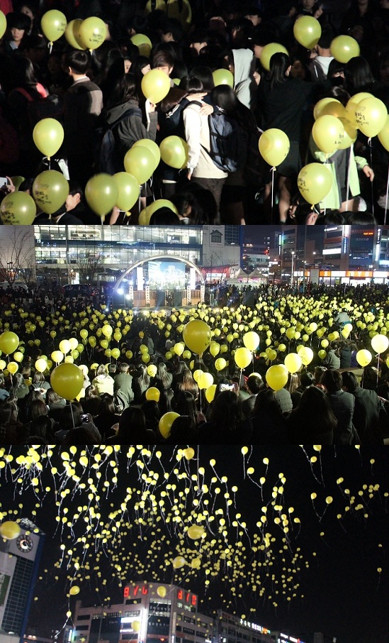 행사 막바지에 주최 측이 준비한 1천개의 노란 풍선이 학생들에게 전달됐다. 추모제 내내 숙연한 표정이었던 학생들의 얼굴에 미소가 피었다. 풍선에는 ‘희망을 노래합니다’라는 글귀가 적혀있었다. 한 학생이 풍선을 놓치자 여기저기서 탄식이 터져 나왔다. 학생들은 풍선을 놓치지 않으려 서둘러 손목에 줄을 감았다.
