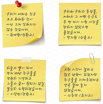 이어서 마이크를 잡은 한예령(성환고3)양은 “작은 나무가 거센 비바람을 맞고 더 크고 강한 나무로 자라듯, 힘든 시간과 고통을 이기고 저 하늘의 별이 된 사람을 잊지 말고 기억해야 한다”며 ”어둠은 빛을 이기지 못한다. 암담한 현실의 어둠을 우리의 빛으로 밝혀야 한다”고 또박또박 말했다. 추모사를 준비한 남학생 3명과 여학생 2명 중 마지막 순서로 등장한 신창영(초지고3)군은 특히 어른들에게 호소했다.