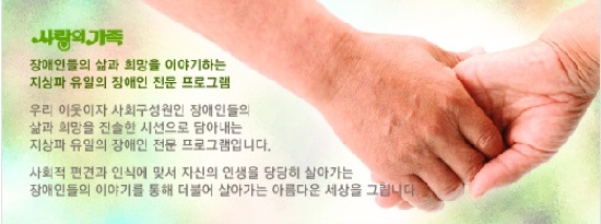 방송은 정규편성을 통해 장애인, 사회적 약자에 관련된 사회적 메시지를 지속적으로 전할 수 있다. 한국방송(KBS)의 <동행>(KBS1)은 경제적 형편이 어려운 사람들, 장애인, 다문화가정 등 소외된 우리 이웃들의 이야기를 전한다. <사랑의 가족>(KBS1)은 장애인들의 삶과 희망을 이야기하는 장애인 전문 프로그램이다. 이들 프로그램 게시판에는 감동을 받았다는 소감, 출연자를 돕고 싶다는 의견, 응원의 메시지 등을 담은 글들이 줄지어 올라온다. 시청자들에게 장애인에 대한 관심을 불러일으키고 장애인들과 일반인이 함께 살아가는 방향을 제시한다는 점에서 이 프로그램들은 공익성이 높은 프로그램이다. 하지만 여전히 TV 속 장애인의 모습은 절망 속에 희망을 잃지 않고 살아간다는 미담에 초점이 맞춰져 있다. 다른 미디어에서 취급하는 방식도 그들의 삶을 오롯이 드러내기보다 부분적인 모습을 그려내는데 지나지 않는다. 장애인은 여전히 세상에서 소외받고 있는 것이다. 장애인을 바라보는 관점을 바꿀 필요가 있다.