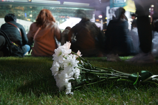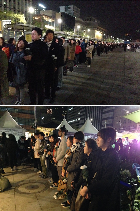 경찰과 시위대의 대치가 계속되는 동안 광화문 분향소에는 다른 길로 온 시민들이 줄지어 참배했다. 순서를 기다렸다가 영정 앞에 국화꽃을 올리려는 시민들의 행렬이 광장이 끝나는 광화문 앞까지 이어졌다. 기다리는 동안 연신 울먹이는 시민들도 눈에 띄었다. 한쪽에서는 노란 종이배 접기, 정부시행령폐기 국민투표 서명 등의 캠페인도 진행됐다.