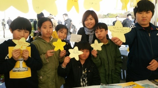 행사가 취소됐다는 소식에 많은 사람들이 빠져나갔지만 추모의 뜻을 담은 작은 행사들은 합동분향소 일대에서 그대로 진행됐다. 카드에 추모의 글귀를 써서 팽목항으로 보내는 ‘팽목항 편지’ 코너에서는 초등학생들이 고사리 손으로 또박또박 편지를 써 내려갔다. 안산시 상록구 일동의 방과후교실 ‘우리동네지역아동센터’의 어린이 30여명은 오후 3시 50분 대절한 버스로 분향소를 찾았다. 3~4학년 담임을 맡고 있는 사회복지사 김혜란(40․안산시 일동)씨는 “그동안 아이들이 무섭고 두려워할까 봐 분향소에는 못 데려왔는데 1주기라 의견을 물었더니 아이들도 오고 싶어 했고 부모님들도 찬성해 오게 됐다”고 말했다. 안산시 일동에는 세월호 사고 희생자가 없지만, 공동육아어린이집 등이 주축이 돼 지난 1년간 아이들과 어른들이 매주 금요일마다 촛불을 들고 동네를 한 바퀴 돌거나 세월호 관련 영상을 보고 편지를 낭독하는 등의 ‘동네촛불’ 행사를 이어왔다고 한다.