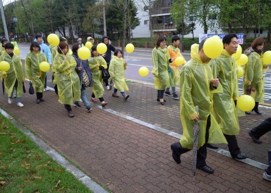 이날 오전부터 내리던 빗줄기가 오후 3시쯤 잦아들자 유가족과 자원봉사자, 조문객 등 200여명은 노란 우비를 입고 ‘잊지 않겠습니다’라고 적힌 노란 풍선을 든 채 단원고까지 4.5킬로미터(km)추모행진에 나섰다. 제종길 안산시장, 이재정 경기도교육감, 조희연 서울시교육감, 그리고 안산시와 자매결연한 제천시의 이근규 시장이 행렬의 맨 앞에 섰다. 길가에서 행렬을 바라보던 김형주(43·여)씨는 “대통령이 오늘 안산을 찾지 않고 정치하는 사람들끼리 팽목항에 갔다고 들었다”며 “그들만의 추모제는 쇼”라고 꼬집었다.