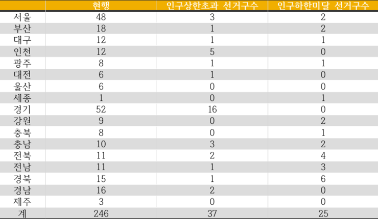 전국 246개 국회의원 선거구 중 상한 인구수(약 30만)를 초과하는 선거구가 37개, 하한 인구수(약 13만)에 못 미치는 선거구가 25개다. 인구수 상한을 넘어 선거구가 늘어나는 곳은 인구밀집 지역인 서울, 인천, 경기다. 이 지역은 위헌 선거구가 되어 인구수에 맞게 더 많은 선거를 치를 수 있다. 하지만 인구가 적은 농촌 지역에서는 국회의원 수를 줄이는 곳이 많이 발생하게 된다. 선거구 조정을 단순히 인구 계산으로만 접근해서는 원만한 해결이 불가능하다.