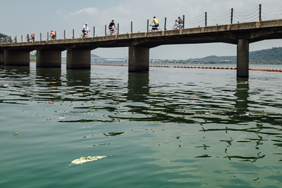 ▲ 조류경보가 발령된 지 엿새째인 4일 오전 서울 마포구 성산대교 남단 합수부 교량 아래 죽은 물고기가 떠 있다. ⓒ 하상윤