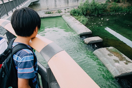 ▲ 성산대교 북단 홍제천 합수부 인근에서 한 어린이가 짙은 녹색으로 변한 한강 물을 보고 있다. ⓒ 하상윤