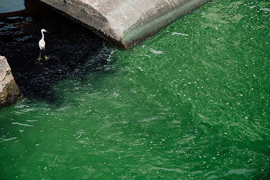 ▲ 서울 마포구 성산대교 북단 홍제천 합수부 인근에서 백로가 짙은 녹색으로 변한 한강 물을 앞에 두고 서 있다. ⓒ 하상윤