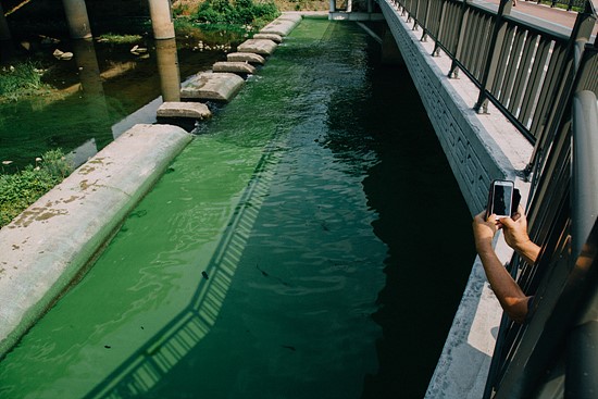 ▲ 성산대교 북단 홍제천 합수부 인근에서 한 시민이 산책을 멈추고 짙은 녹색으로 변한 한강 물을 촬영하고 있다. ⓒ 하상윤