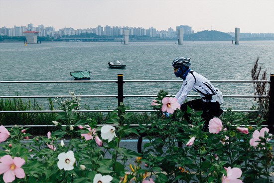▲ 성산대교 북단 공원에서 초록빛으로 변한 한강을 배경으로 시민들이 자전거를 타고 있다. ⓒ 하상윤