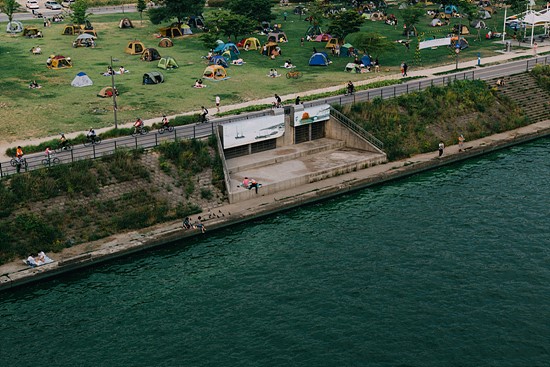 ▲ 성산대교 북단 망원한강공원 잔디밭에서 시민들이 텐트를 치고 휴식을 취하고 있다. 가장자리를 따라 흐르는 한강 물은 짙은 녹색이었다. ⓒ 하상윤