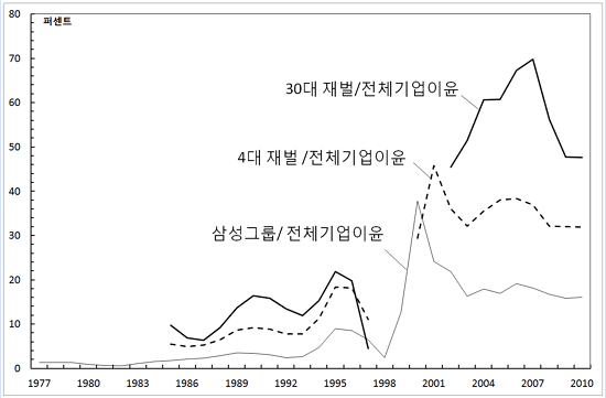기업 전체의 소득에 견주어 삼성그룹, 상위 4대 재벌, 30대 재벌의 순이윤 비율을 표현한 그래프로 재벌기업의 자본축적 궤적을 확인할 수 있다.