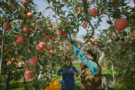 사과 밭에선 웃음소리와 함께 흥겨운 노랫소리도 들린다. "여자는 꽃이랍니다~" 흥얼흥얼 노래를 따라 부르며 사과를 따던 박춘자씨는 “음악을 틀어주면 사과가 더 잘 자란다”며 “익은 사과를 탐내는 새를 쫓는 데도 도움이 된다”고 설명했다.
