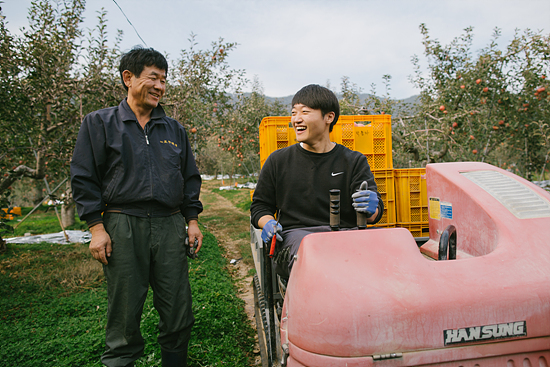 아침저녁으로 쌀쌀해지면서 푸른 산이 울긋불긋한 단풍으로 물들 즈음이면 사과도 알알이 붉은 빛으로 익어간다. 잘 익은 사과는 제때 따서 보관해야 아삭아삭한 맛이 오래가기 때문에 사과밭은 요즘이 농번기다. 사과는 수확 시기에 따라 조생·중생·만생종으로 나뉘는데, 만생종인 부사를 키우는 해맞이농원은 10월 하순부터 11월 초순 열흘 사이에 일제히 수확해야 한다.