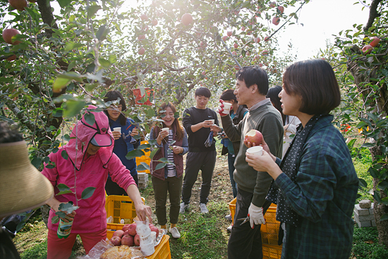 과수원의 터줏대감인 박춘자씨의 친절한 설명에 양쪽 손에 장갑을 낀 학생들이 바구니를 하나씩 챙겨 저마다 사과나무로 향한다. 사과밭으로 들어가면 잘 익은 사과들이 내뿜는 향기가 코끝에 새콤달콤하게 전해진다. 새들이 쪼아먹은 사과 구멍에 벌들이 과즙을 빨아 먹고 있는 모습을 보면 가을은 미물들에게도 풍요의 계절인 모양이다.