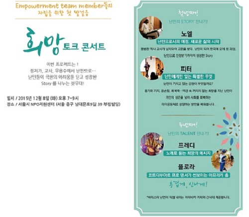 피난처는 난민들과 우리 국민이 서로 소통하고 연결되는 작은 고리를 만든다는 취지에서 다음달 8일 저녁 7시 <희망토크콘서트>를 열 계획이다. 서울 중구 남대문로의 서울시 엔피오(NPO)지원센터에서 콩고, 우간다, 코트디부아르 출신 난민 4명이 그들의 경험과 꿈을 이야기한다. 이 자리에서 피오피오씨는 그동안의 삶을 얘기하고 노래도 부를 계획이다.