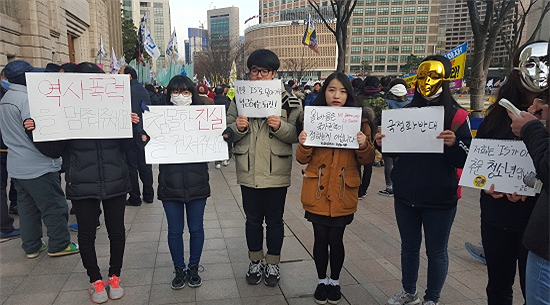 ‘국정교과서반대청소년행동’ 소속 중•고등학생 10여명은 ‘사람숲’이란 깃발 아래 왁자지껄 웃고 있었다. 이들은 이날 오후 3시 종각역 5번 출구 영풍문고 앞에 모여 서울광장까지 걸어왔다고 했다. 이 중 전남 강진에서 올라온 장희도(19)군은 얼마 전 대입 수학능력시험을 봤다. 그에게 역사는 단순한 수능 출제과목이 아니라, ‘과거를 통해 미래를 배우는 거울’이다. 장군은 “독일에서 히틀러에 대해 설명하는 게 히틀러를 따르자는 건가요?”라며 교과서의 북한 주체사상 기술부분을 문제 삼는 사람들을 꼬집었다.