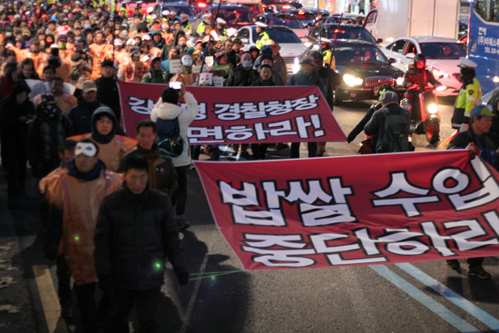 문씨는 “농산물은 상품이 아닌, 사람이 먹고 사는 생명의 문제로 접근해야 한다”고 강조했다. 이날 민중총궐기에서 농민들은 ‘밥쌀용 쌀 수입 저지와 쌀값 보장’, ‘기초농산물 국가수매제 쟁취’를 주창했다. 기초농산물 국가수매제는 국가가 주요농산물에 대해 식량자급계획을 세우고 생산과 유통, 가격 전반을 책임지고 관리하는 제도다. 정부는 지난 2005년 쌀 수매제를 폐지하고 쌀값 하락분의 일부(시세와 기준치 차액의 85%)를 보전해주는 쌀직불금제를 실시하고 있지만, 농민들은 예산 제한으로 실질적인 소득보전이 안 된다며 쌀값 시세보장을 요구했다.