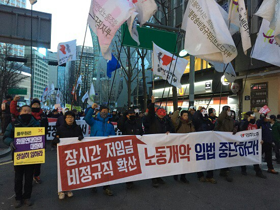 광장에 나온 노동자들은 정부여당이 추진 중인 노동관계법 개정을 막아야 한다고 목청을 높였다. 일반해고 요건 명확화, 기간제 근로기간 연장, 파견근로 업종 다양화, 임금피크제 실시, 취업규칙 불이익 변경기준 완화 등을 담은 법안이 노동자를 벼랑으로 몰 것이라고 보기 때문이다.