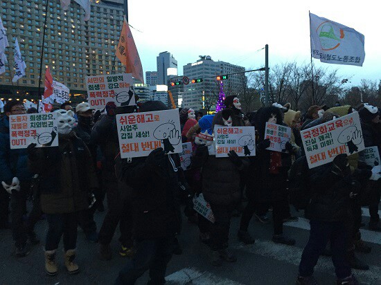 시스템통합(SI) 업체에서 일하는 이태우(42)씨는 정규직이지만 계약관계에서 갑이나 을이 아니고 병, 정도 못 되는 ‘무(戊)’라고 자신의 입장을 평했다. SI는 정부나 기업의 정보시스템을 구축·운영하는 산업이다. 대기업이나 정부기관이 SI업무를 발주하면, 대기업의 IT자회사를 거쳐 중소기업의 IT회사, IT인력파견업체를 거쳐 개발자에게 이른다. 5단계에 걸친 도급이 이뤄지는 것이다. 산타클로스 가면을 쓰고 나온 이씨는 정부의 노동개혁에 대해 “정규직을 구축하고 비정규직을 양산하는 개악”이라며 “그나마 남아있는 을을 무로 바꾸는 법”이라고 성토했다.