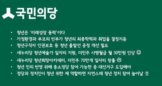A. 국민의당은 “공정한 출발”을 청년공약을 슬로건으로 내세웠다. 결국 모든 사회문제는 불공정한 기회에서 시작된 것이다. 정치권은 그동안 밥그릇 싸움에만 혈안이 되어 이를 방관하였다. 국민들의 삶은 뒷전으로 하고 선심성 공약만 남발하였다. 그 결과 우리 모두의 삶은 그동안 제자리걸음을 하였다. 이러한 현상을 개개인의 노력 탓으로 일관해서는 안 된다. 불합리한 사회구조에 대해 청년들은 끊임없이 문제를 제기해 왔다. 정치와 정치권이 비판과 대안의 목소리를 공약과 정책으로 옮겨 실천해야 하는 이유다. 그것이 바로 민주정치이며, 정당과 정치인이 있는 이유다.