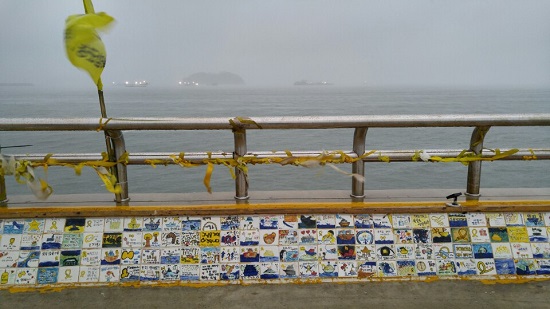 유가족들이 머물던 팽목항 등대로 향했다. 서있기도 힘들 만큼 거센 바람이 방문객을 맞았다. 뒤늦게 찾아온 이들을 원망하듯 성난 파도가 그르렁거렸다. 난간에는 아이들을 추모하는 현수막이 연이어 걸렸다. ‘축구를 좋아하는 영인이’의 그림 속 얼굴도 비를 맞고 있었는데 눈물을 훔쳐내려는 듯 현수막이 펄럭거렸다.