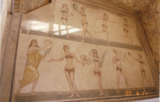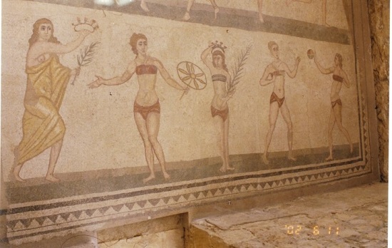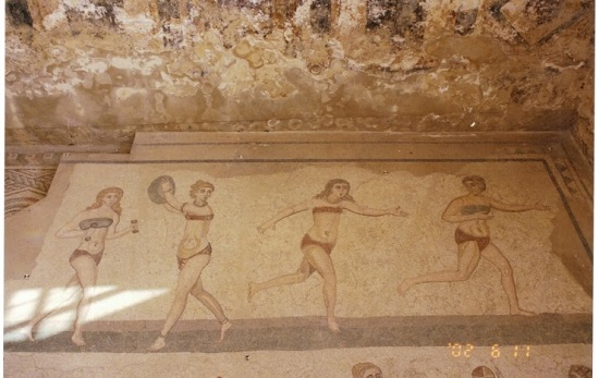 목까지 차오른 호기심을 누르며 카살레 빌라 안으로 들어가 비키니 모자이크를 자세히 뜯어볼게요. 요즘 연립주택이나 저층 아파트를 흔히 빌라라고 부르는데요. 로마시대 빌라는 그게 아니고요. 라티푼디움(Latifundium). 그러니까 귀족이 갖고 있는 광대한 토지의 농장 저택을 가리킵니다. 중세의 영주들 성이나 미국 LA 서쪽 60km 지점 말리부 해안의 호화 주택을 떠올리면 이해하기 쉽겠죠. 카살레 빌라는 4세기 초 건축됐어요. 빌라 내부 침실 가운데 한곳의 바닥을 '비키니' 모자이크가 장식하고 있는 거예요.