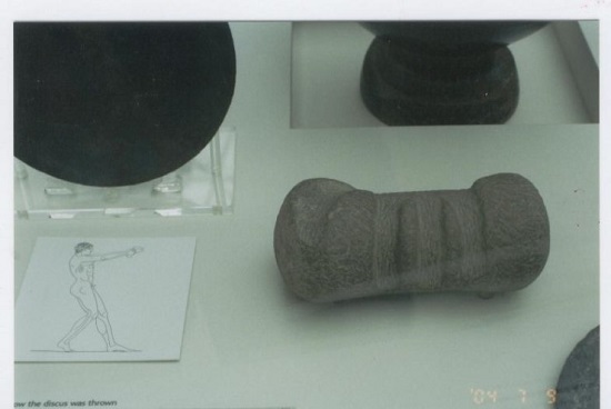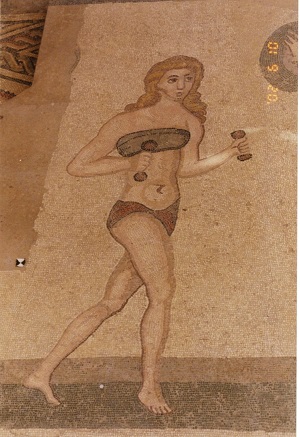 윗줄 왼쪽 첫 번째 여성이 무엇인가 들었는데... 아령을 들고 서울 양재천을 거니는 여인네 모습이 연상되죠. 로마여인도 아령을 들고 살 빼려 걷는 것인가요? 손에 든 도구는 할테레스(Halteres)라고 부릅니다. 할테레스를 양손에 들고 앞뒤로 흔들다 앞으로 펄쩍 뛰어오르는 멀리뛰기 경기를 벌이는 중이에요. 멀리뛰기는 고대 올림픽 5종경기(단거리 달리기, 멀리뛰기, 창던지기, 원반던지기, 레슬링)의 한 종목이죠. 손을 흔들 때 리듬을 곁들이면 효과가 좋다하여 아울로스(Aulos, 관이 두 개 달린 고대 그리스 피리)를 연주했어요. 할테레스는 오늘날까지 유물로 전해지는데 평균 4.5kg에 길이 12~29cm의 돌덩이랍니다.