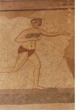 왼쪽 두 번째 여인은 원반을 던지려는 중이죠. 원반던지기도 고대 올림픽 5종경기의 한 종목이었어요. 당시 원반의 두께는 0.5cm. 청동, 납, 대리석으로 만들었고요. 직경은 17cm에서 35cm, 무게는 1.5kg에서 6.5kg까지 다양해요.