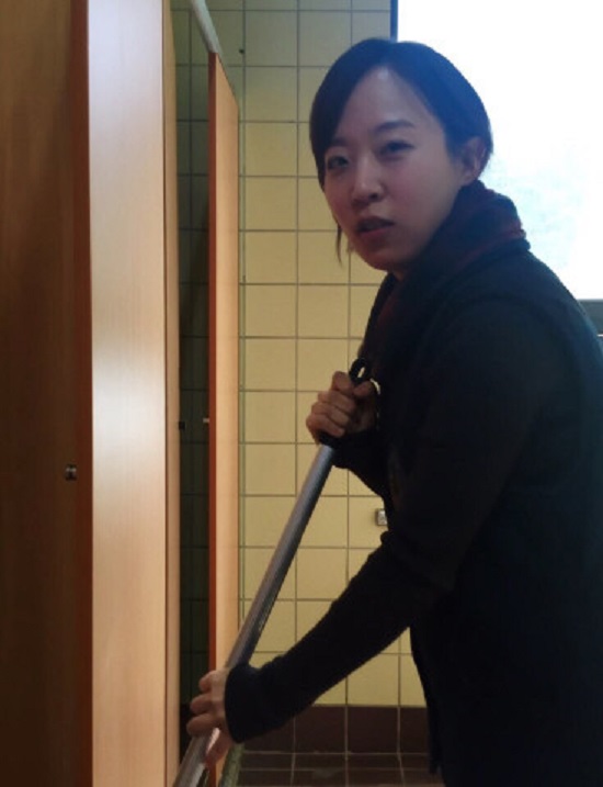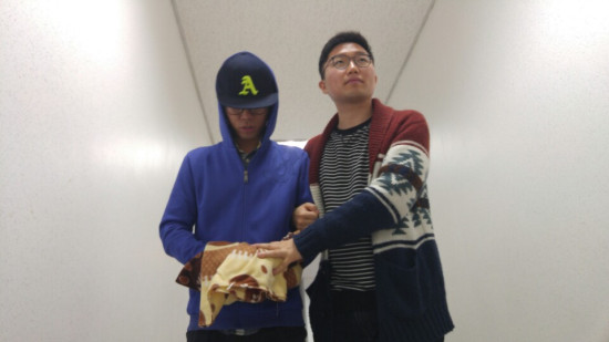 위 사진에는 노트북이 얼굴 밑에 있다. 노트북을 얼굴 높이와 맞추기 위해서는 노트북을 들어야 한다. 양손으로 들고 찍어야 신문에 나갈 수 있는 사진이 된다.