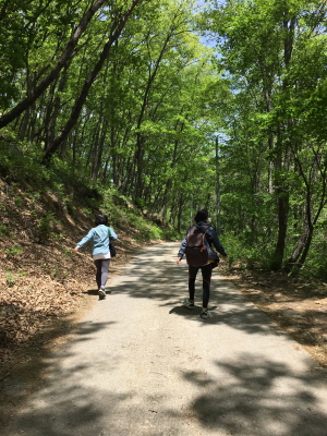 자드락길 2코스의 시작은 한여름에도 얼음이 언다는 능강계곡 위 능강교 입구다. 2코스 자드락길의 시작점에서 안내판을 따라 조금 더 안쪽으로 들어가면 두 갈래 길이 나온다. 왼쪽 큰 다리를 건너면 정방사로 향하는 정방사길이고, 오른쪽으로 가면 얼음골생태길로 가는 자드락길 3코스다. 갈림길에 나무판으로 만든 아기자기한 표시판이 있어 구분하기 쉽다. 산길이 급하지 않아 여유 있게 산을 올랐다. 산길 옆으로는 차로 지나다닐 수 있는 도로가 깔렸고, 정방사 입구 근처에 주차장이 마련되어 산행이 어려운 사람들도 편히 오갈 수 있다.