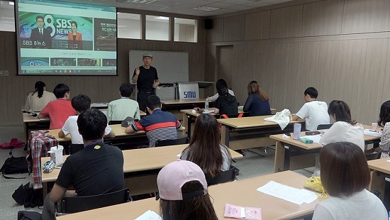 김문환 교수는 ‘레벨업, 방송리포팅’ 강의를 통해 SBS 등에서 20여 년간 보도한 경험을 바탕으로 참가자 개개인의 리포팅 억양과 발성 등을 일일이 지도했다. 그는 “아직 목으로만 소리를 내는 학생들이 많다”며 “직접 소리 내어 연습하는 게 우선”이라고 말했다.