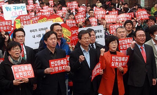 한나라당은 2006년에 처음 ‘반값 등록금’을 공약으로 내걸었지만, 여당이 된 뒤 “등록금액이 아니라 부담을 절반으로 덜어주겠다는 의미”라고 번복한 바 있다. 그러다 4․27 재보선 뒤 황우여 의원을 중심으로 ‘반값 등록금’이 실현돼야 한다는 주장이 제기되고 있다. 소득 구간 하위 50%까지 대학 등록금을 지원하겠다는 것이 골자다.