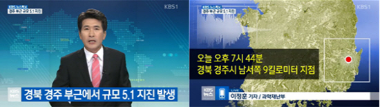 KBS를 향한 비난이 거세다. 12일 경북 경주시 남서쪽에서 발생한 두 차례 지진에 대한 보도가 미흡했다는 이유다. KBS는 1, 2차 지진 발생 이후 각 3분 30초가량의 뉴스특보를 내보냈다. 두 뉴스특보 모두 “자세한 소식을 이후 정규 뉴스에서 전하겠다”며 마무리했고, 리포트 이후 기존 정규 방송인 시사교양 프로그램 <우리말 겨루기>와 일일연속극 <별난 가족> 방송을 이어갔다. KBS는 다음날 보도자료를 통해 “지진 발생 관련 자막을 내보낸 뒤 속보 체제로 전환하고 속보를 준비했다”고 해명했다. 지진보도는 오히려 민방이나 종편이 돋보였다. JTBC 메인 뉴스 <뉴스룸>은 2차 지진 발생 후 바로 특보 체제로 뉴스 후반부를 모두 지진 관련 보도로 채웠다. 제보 영상을 통해 지진 상황을 전하거나 시민들과 인터뷰를 하고, 전문가 인터뷰 보도를 곁들였다.