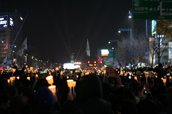 서울 시청역 4번 출구. 진화한 시민들로 발 디딜 틈 없이 붐볐다. 일주일전과 다를 바 없다. 계단을 막 오르자 이미 인파는 서울 시의회 옆 거리까지 들어찼다. 어린이부터 어르신까지 저마다 축제로 승화된 집회 현장을 찾아 걸음을 옮겼다. 생존이 아닌 정의의 촛불에 이끌려 대열의 뒤에 자리 잡았다. 좌우로 흔들리는 불빛들은 아름다웠다. 무당의 빙의(憑依)에 의존하는 샤머니즘 정부의 심장을 겨누는 촛불에 잠시 숙연해지는 사이 뒤편도 촛불로 가득 찼다. 빛 가운데서 발견할 수 있는 건 진실을 갈구하는 사람들의 열정과 웃음이었다.