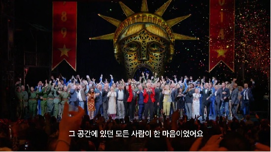 뮤지컬 무대 위에서 배우들이 순간적으로 뿜어내는 에너지가 스크린으로 옮겨져도 그 감동은 여전할까? 기대를 안고 실황 공연을 보러 가면서도 의문스러웠다. 그러나 스크린으로 보는 실황이 직접 보는 공연에 비해 감동이 떨어질지도 모른다는 우려는 기우였다. 카메라 시선으로 재현된 실황 공연은 공연장의 분위기를 느끼는데 모자람이 없었다. 오히려 카메라 클로즈업으로 인물의 표정과 감정을 생생하게 담아내 몰입도가 높았다. 다양한 카메라 각도로 화려한 무대 디자인을 꼼꼼하게 볼 수 있다는 것도 장점이었다. 영화적 요소인 편집도 생생한 공연 분위기를 전달하는데 일조했다. 특히 큰 스케일의 무대를 높은 곳에서 조망하는 화면에 인물들의 표정을 덧씌워 편집한 장면은 전체와 디테일의 조화를 살린 연출이다.