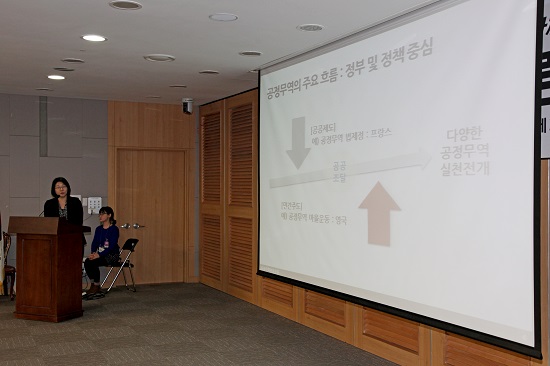 쿠피 협동조합의 김선화 연구원은 정부 정책과 의회의 역할과 관련한 해외사례를 중심으로 발표했다. 김 연구원에 따르면 프랑스는 공정무역법을 만들어서 사회연대경제법안에 공정무역을 넣었다. 공정한 제도를 중심으로 공정무역을 확산시키는 방식이다. 이와 달리 영국은 풀뿌리 운동으로 공정무역을 실현한다. 민간의 자발적인 움직임으로 정부를 움직이는 모양새다. 전체 1,872개의 공정무역마을 중 619개가 영국에 있는 점은 이를 잘 말해준다. 독일 456개를 비롯해 전체 공정무역 마을의 90%가 유럽에 있다.